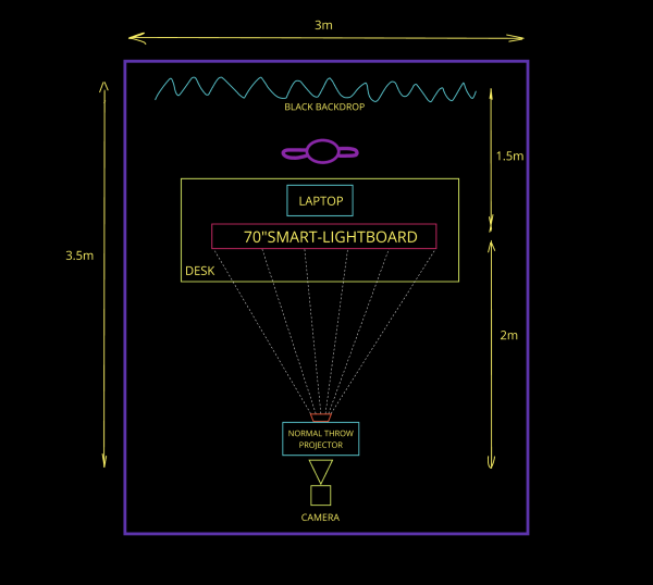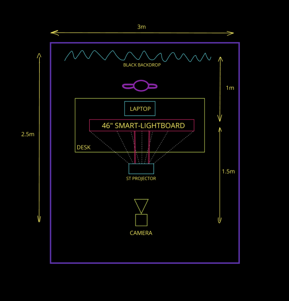 We would recommend a black background, approximately 3 metres wide. Black reflects the least amount of light and also provides the best contrast against the vivid colours and multi-media images on the Smart-Lightboard.